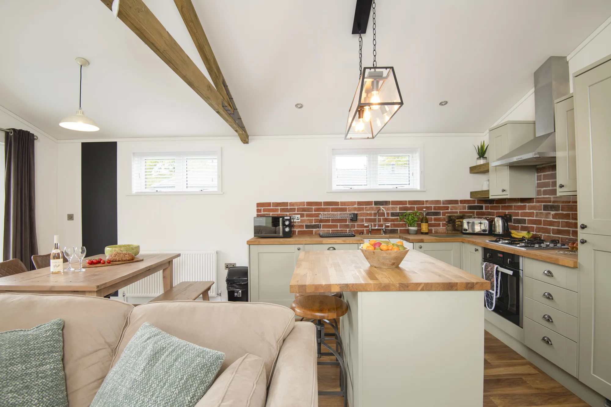 This selection of lodges combine a sense of elegance and comfort and creates the perfect oasis away from the hustle and bustle of day-to-day life. These lodges are fitted with all the modern conveniences catering for families of up to 4 people and have a rustic farmhouse style throughout which fits in perfectly at Lakeview Manor with its countryside surroundings. Upon entry, you will be greeted with a carefully placed storage bench, perfect for removing those muddy boots after a long walk in the surrounding Blackdown Hills. Suitable throughout all seasons choose between relaxing in the living come dining room for a nice cuppa in front of the fire, or head outside for a spot of alfresco dining on the lakes-edge before relaxing in the sunken hot tub and watching the sun set. Maximum 3 dogs /pets allowed.