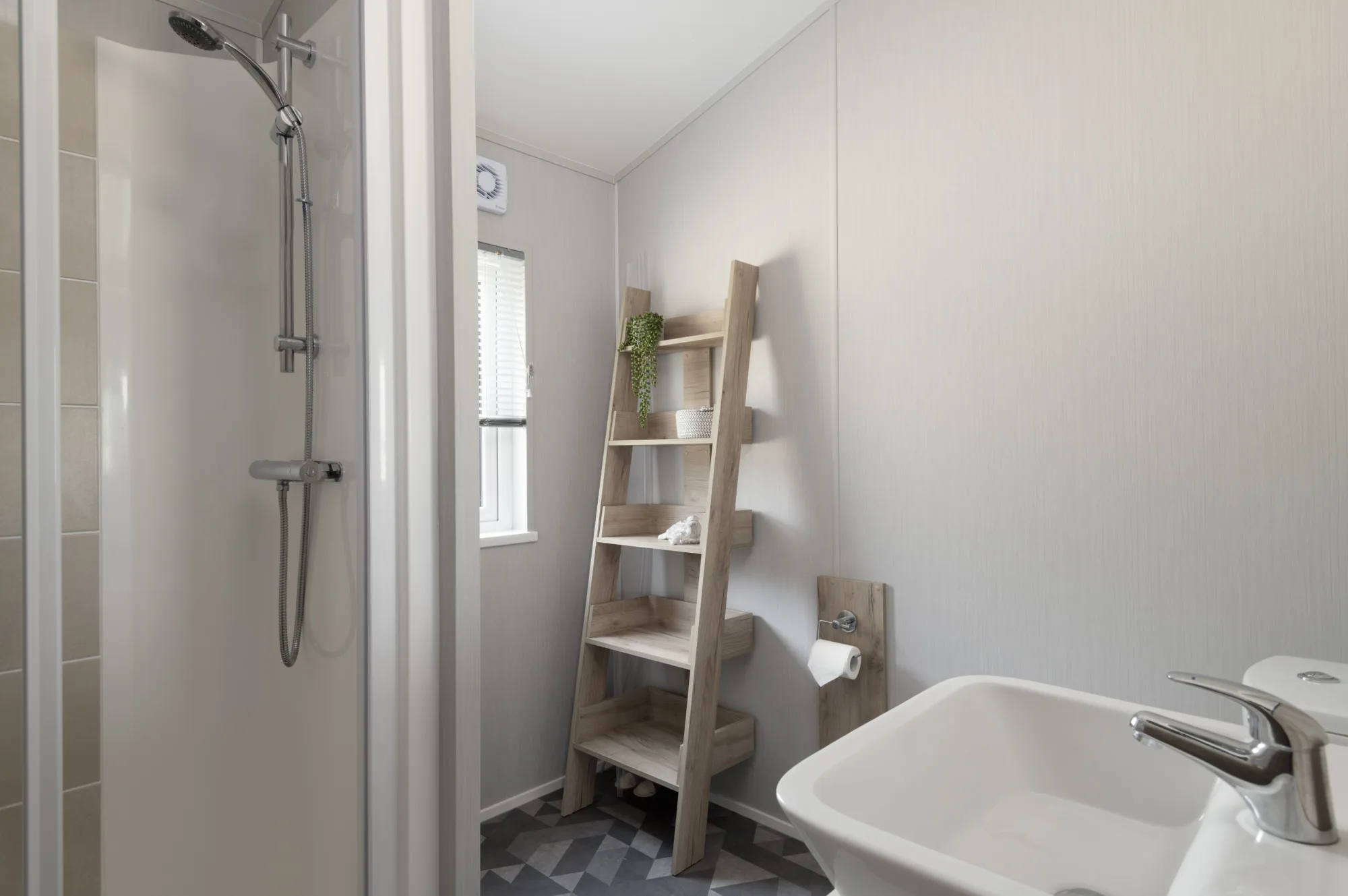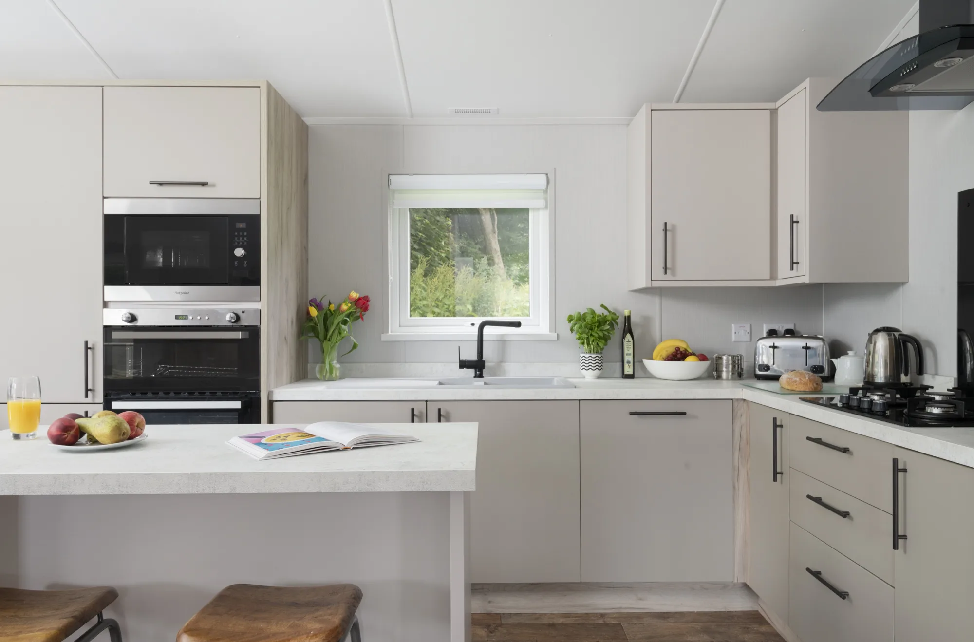 The decking of Mapleton lodge 36 is at the rear and while it doesn’t enjoy the breathtaking views that some lodges boast, it is a convenient short walk to the restaurant and bar and close to Middle Lake. The light, stylish interior and open plan layout create a calming aesthetic, an ideal base for a relaxing break away in Devon. There is one double bedroom with king size bed, and one twin bedroom and pets are welcome so all the family can holiday together! The master bedroom has an en-suite shower room, and the family bathroom has a spacious walk-in shower too. The kitchen has a handy island with bar stools, freestanding fridge freezer, integrated microwave, dishwasher and washing machine. There is one private parking space with EV charger (EV usage charges apply).