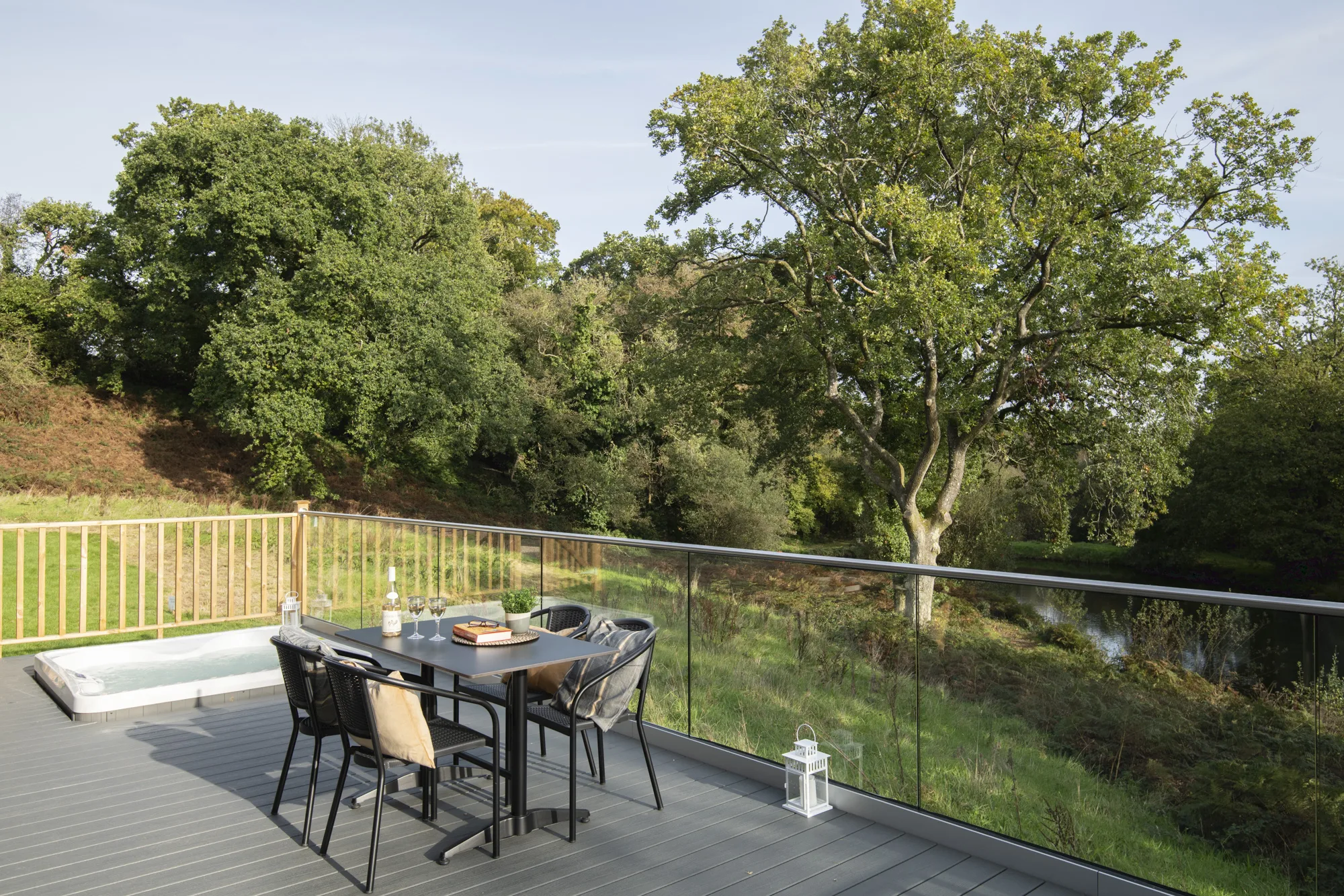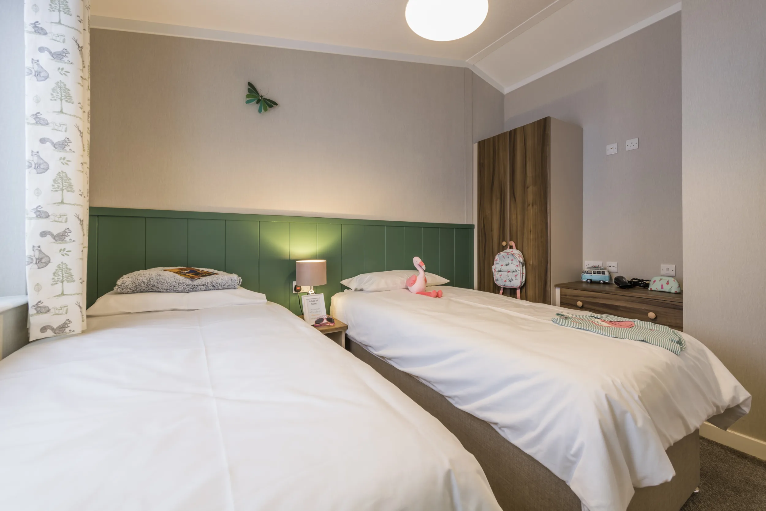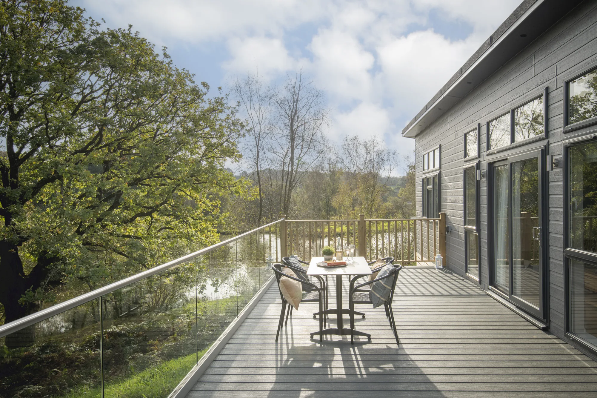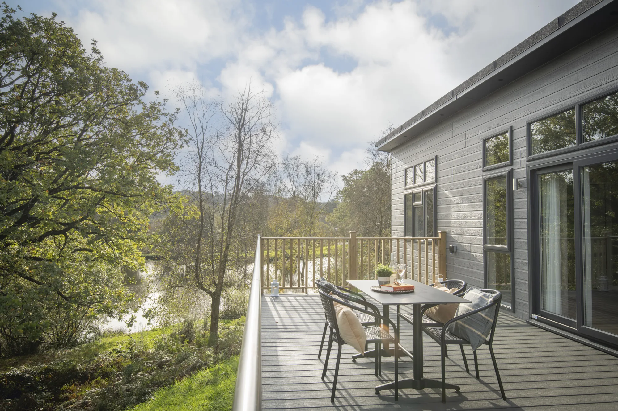 The Valley Lake Front 2 bedroom centre lounge lodges feature a spacious lounge area, decking with hot tub and two bedrooms at either side of the lodge, one with king size bed and ensuite and the other with a twin beds (can be requested to be made up as a double bed if required – please specify at time of booking.) The family bathroom has a bath and the modern, open plan kitchen features a microwave and dishwasher. The spacious lodges are in an elevated location with uninterrupted views of Top Lake and are complete with 2 parking spaces and EV charger (EV usage charges apply). Pets are welcome – maximum 3 dogs /pets allowed.