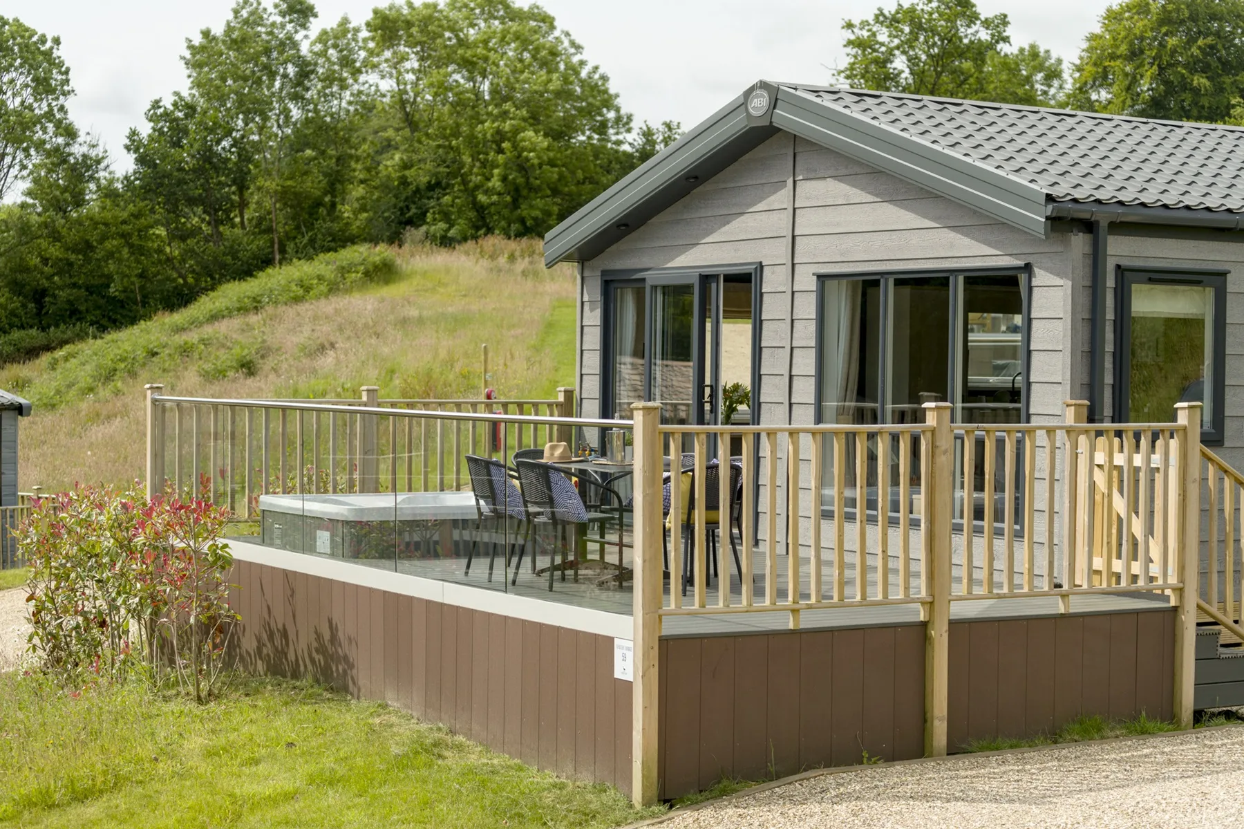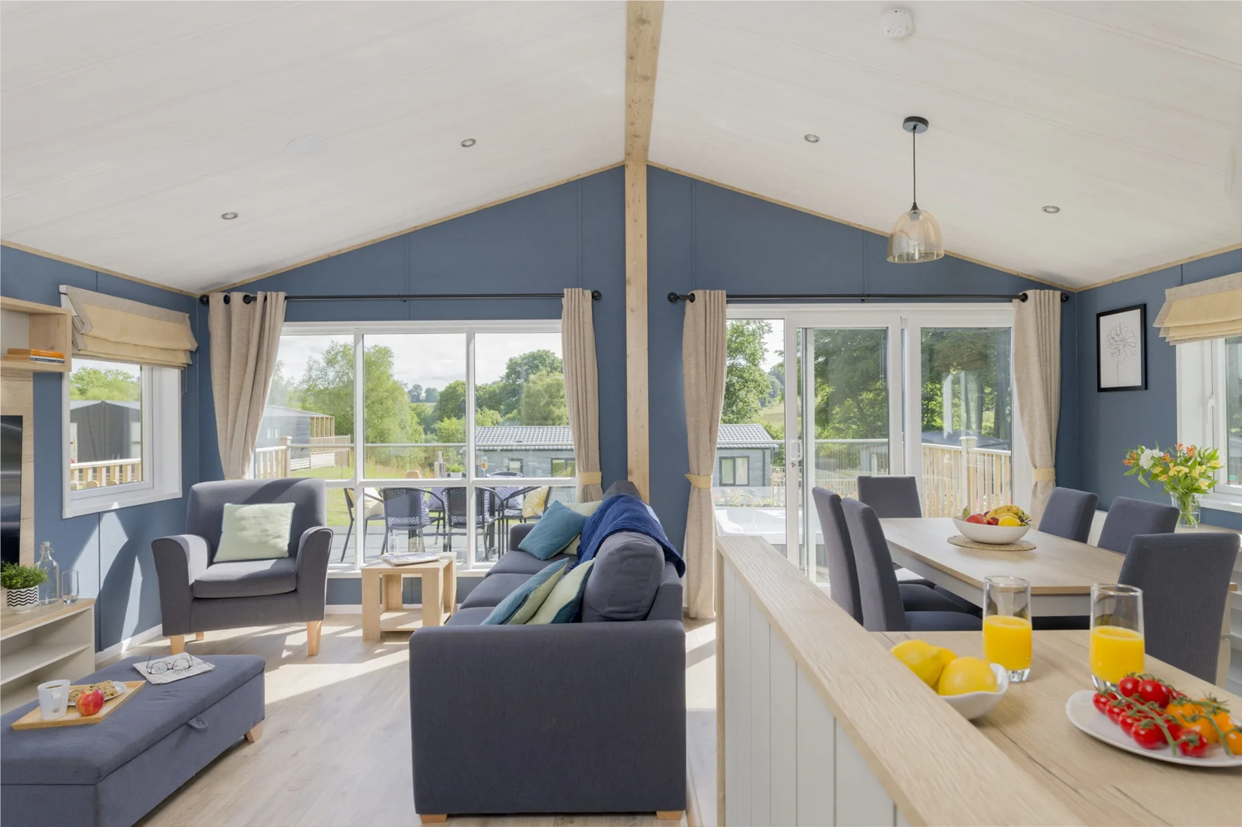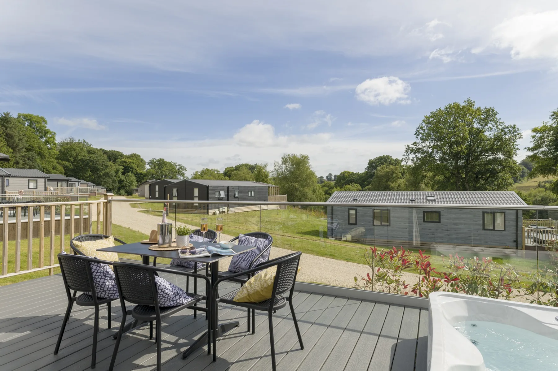 The Valley Park View 3 bedroom Lodges have 1 master bedroom with king size bed and en-suite, 1 twin bedroom and a third bedroom which can be made up as one double bed or two twin beds – please specify at time of booking. The family bathroom has a bath and the modern, open plan kitchen features a microwave and dishwasher. The spacious lodges enjoy a secluded location near Top Lake and are complete with 2 private parking spaces, EV charger (usage charges apply), and a decking with hot tub allowing you to relax in the natural surroundings of the peaceful estate. Pets are welcome – maximum 3 dogs /pets allowed.