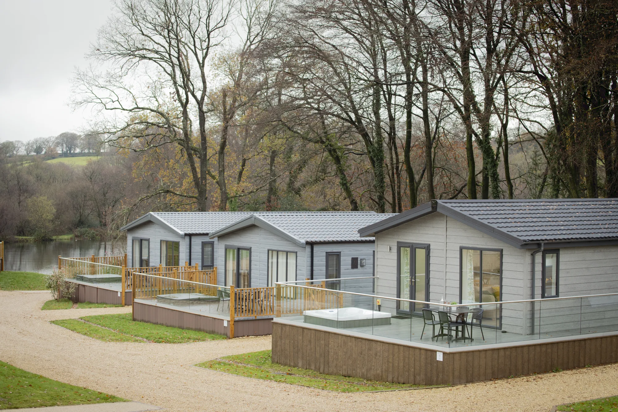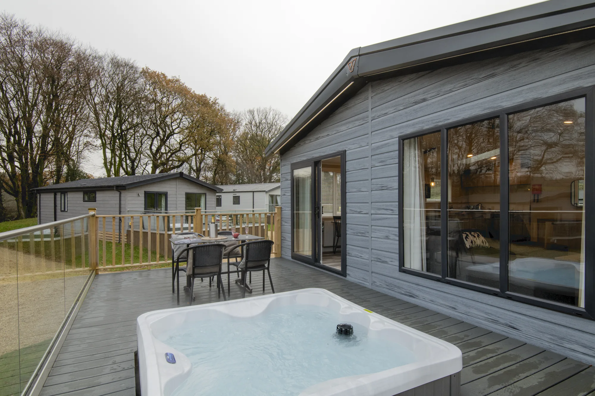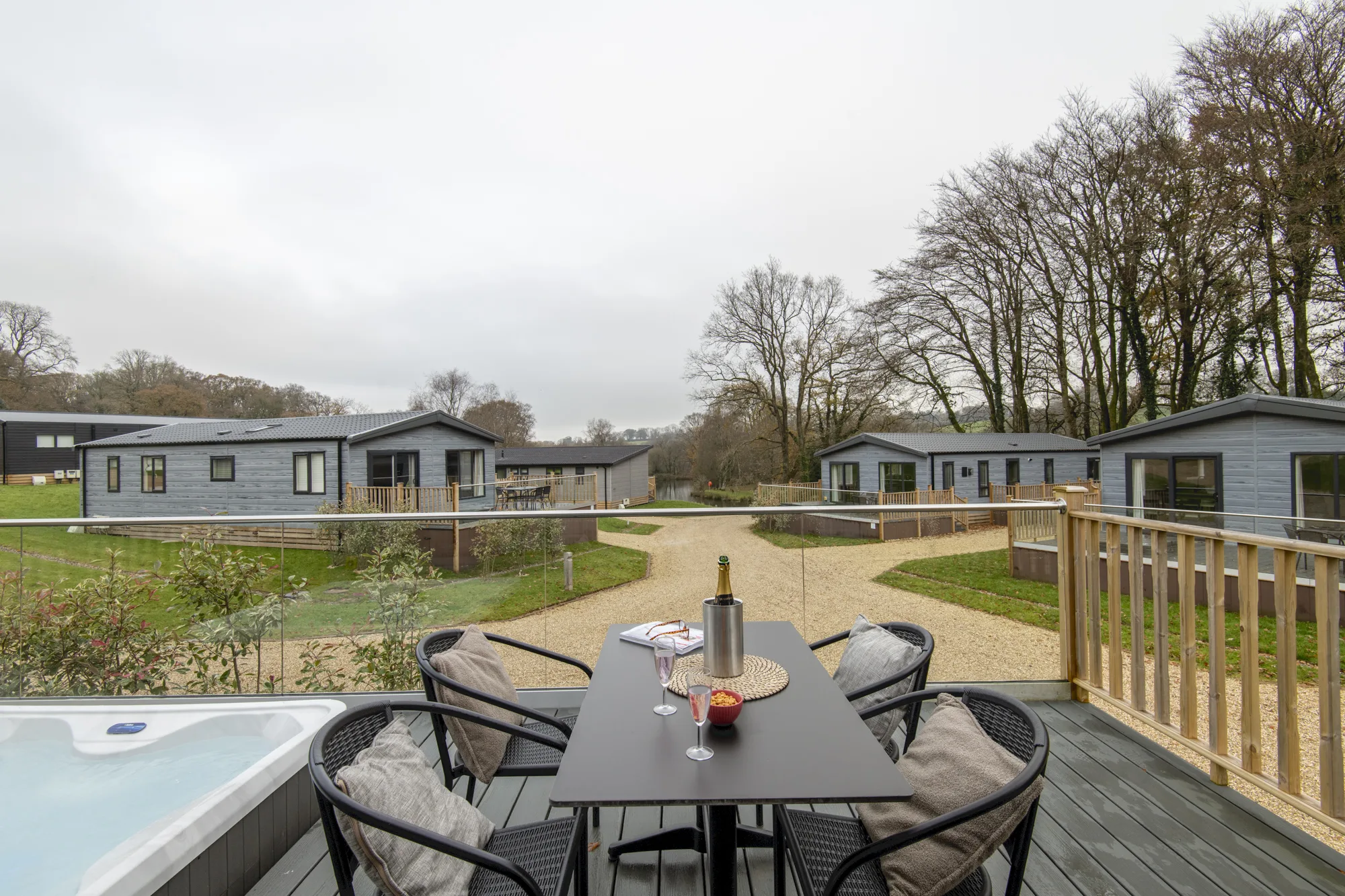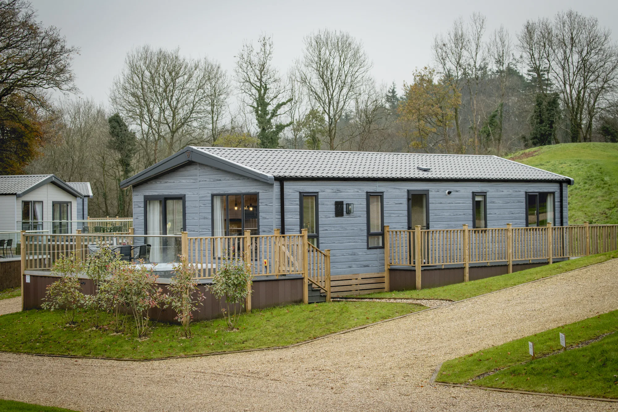 The Valley Park View 2 bedroom Lodges have 1 double bedroom with en-suite and 1 twin bedroom. The family bathroom has a bath and the modern, open plan kitchen includes a microwave and wine cooler. The spacious lodges are tucked away near the Top Lake and are complete with 2 private parking spaces, EV charger (usage charges apply), and a decking with hot tub allowing you to relax in the natural surroundings of the peaceful estate. Pets are welcome – maximum 3 dogs /pets allowed.