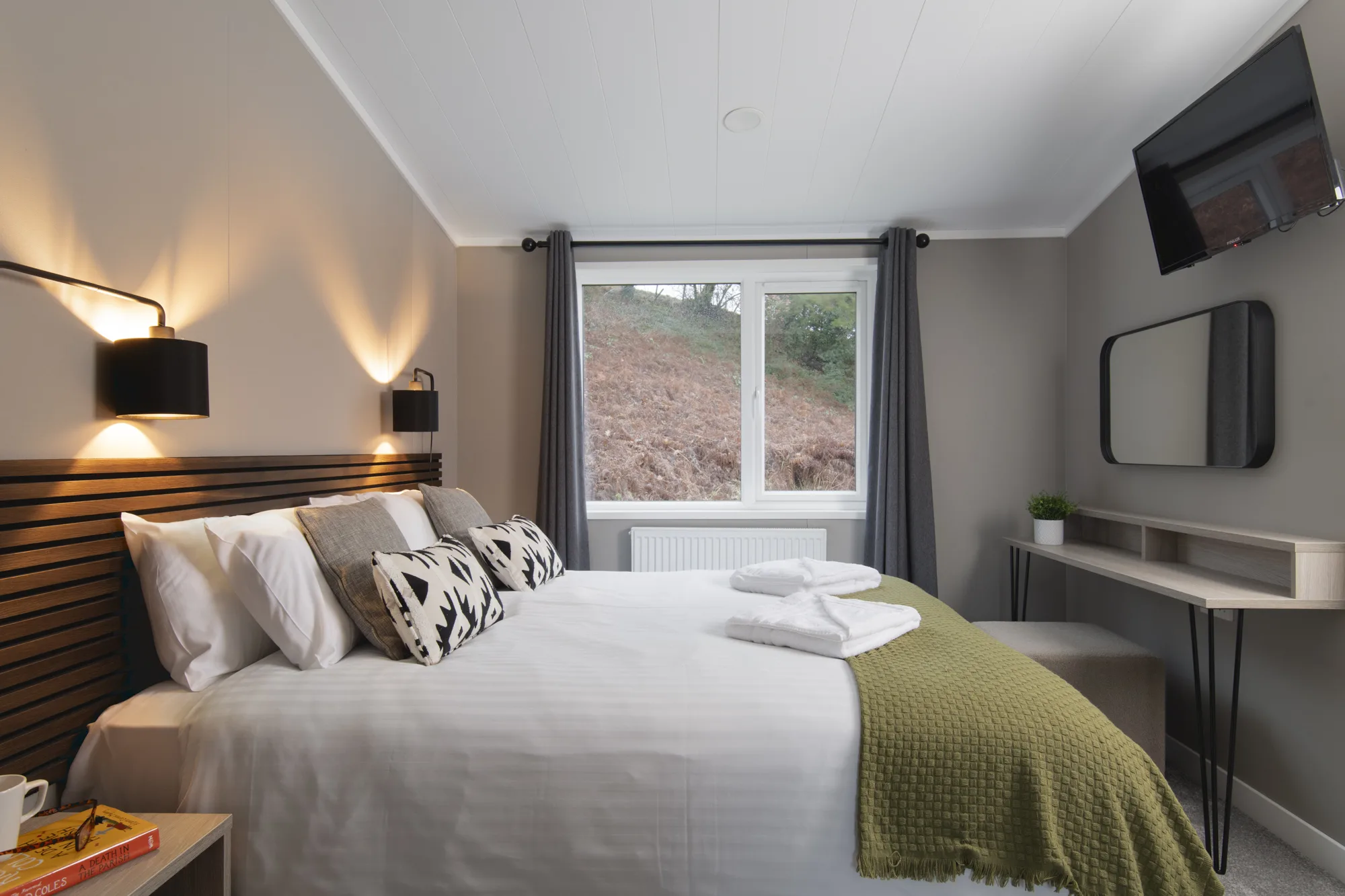 The Valley View 2 double bedroom Lodges have 1 master bedroom with king size bed and en-suite, and a second bedroom with twin beds. The bathroom has a bath and the modern kitchen features a microwave and dishwasher. The spacious lodges are in an elevated location with views across the valley of Top Lake to the hills opposite and are complete with 2 parking spaces, EV charger (usage charges apply), and a private decking with hot tub allowing you to relax in the natural surroundings of the peaceful estate. Pets welcome – maximum 3 dogs /pets allowed.