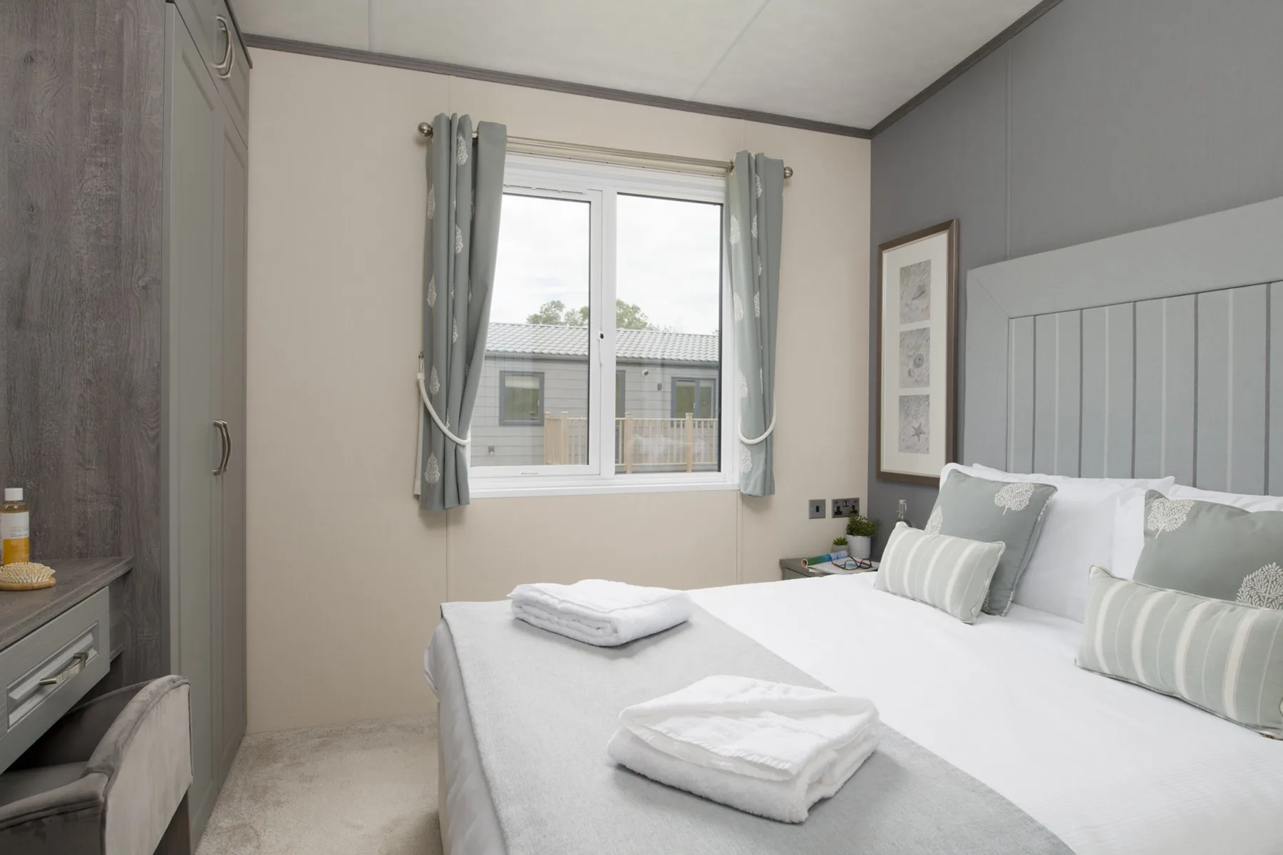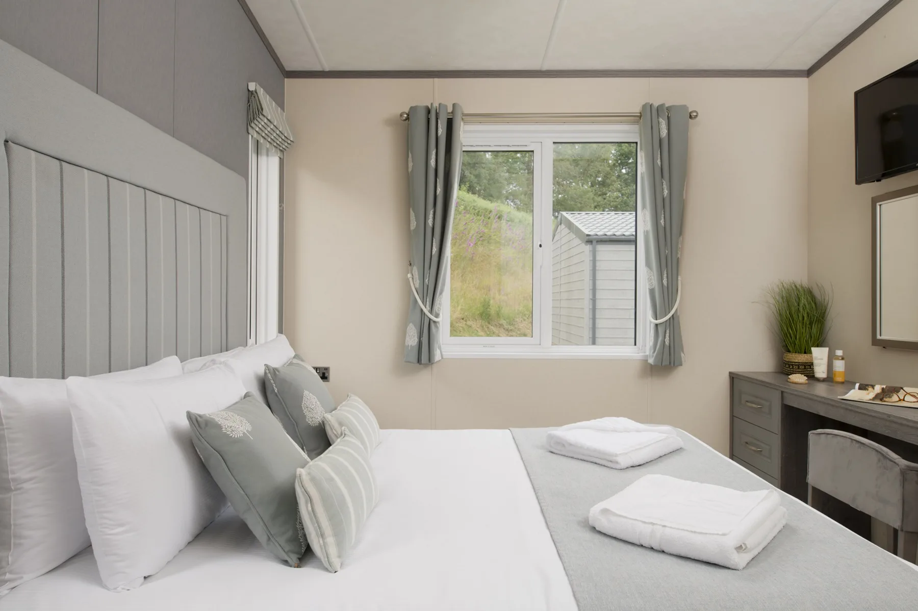 The Valley View 2 double bedroom Lodges have 1 master double bedroom with en-suite and a second bedroom with double bed. There is also a sofa bed in the lounge which sleeps 2. The bathroom has a bath and the modern kitchen features a microwave and dishwasher. The spacious lodges are in an elevated location with views across the valley of Top Lake to the hills opposite and are complete with 2 private parking spaces, EV charger (usage charges apply), and a private decking allowing you to relax in the natural surroundings of the peaceful estate. Pets are welcome – maximum 3 dogs /pets allowed.