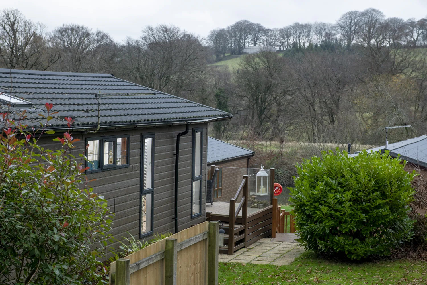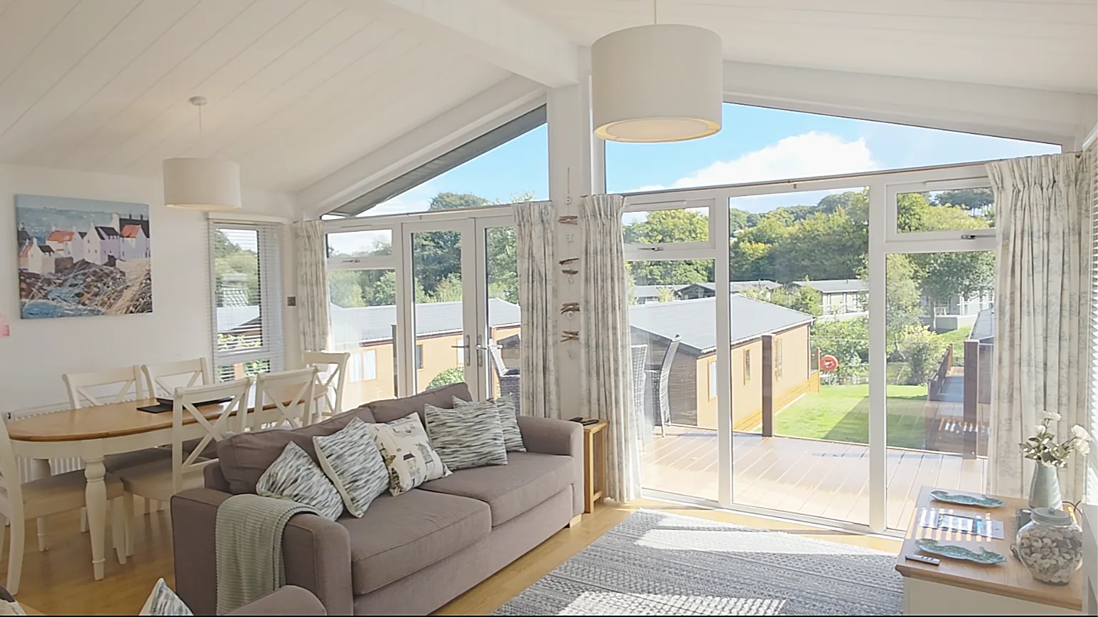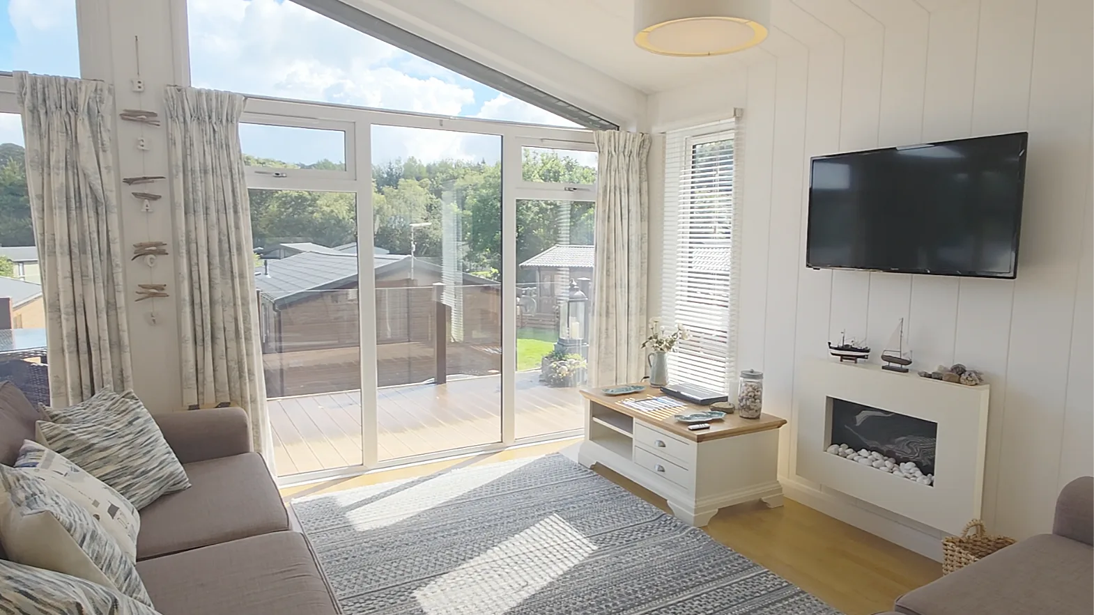 The Pathfinder Tuscany is a 40ft x 20ft fully furnished luxury lodge with 3 bedrooms. Located on the elevated upper tier of Middle Lake, this lodge has vaulted ceilings, and fully glazed end wall with French doors leading out onto a large decking area with glass surrounds and fantastic views, and a hot tub to the side of the lodge.