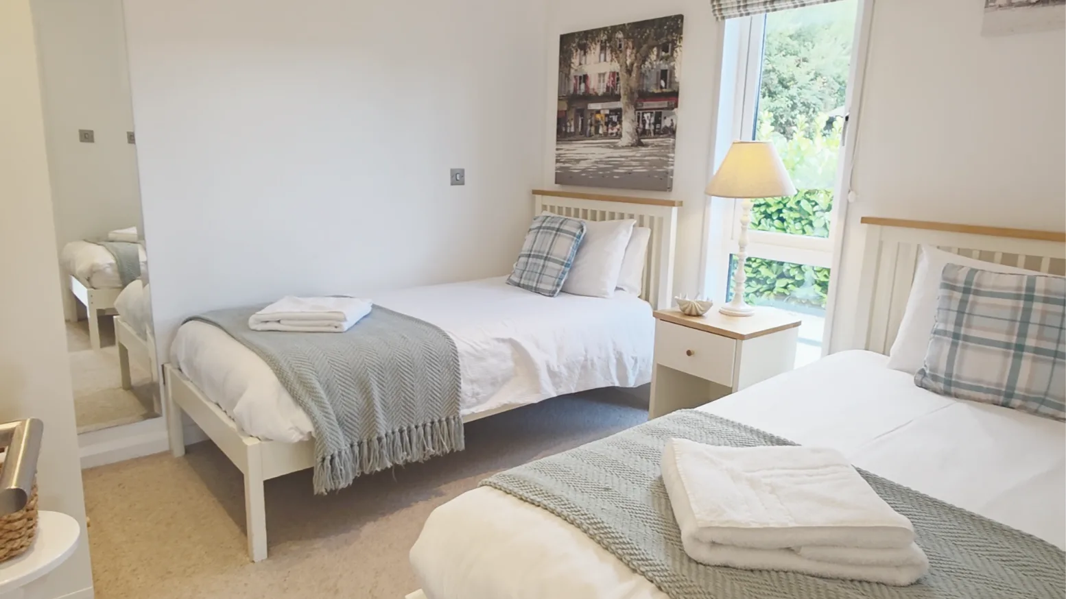 The fully fitted kitchen has integrated appliances, including a dishwasher and washing machine. There is a 40″ smart TV in the lounge.