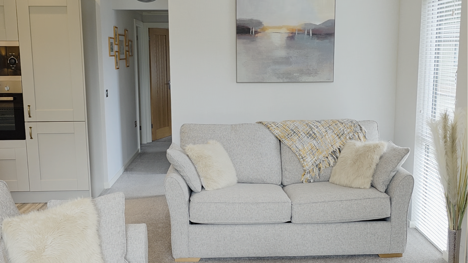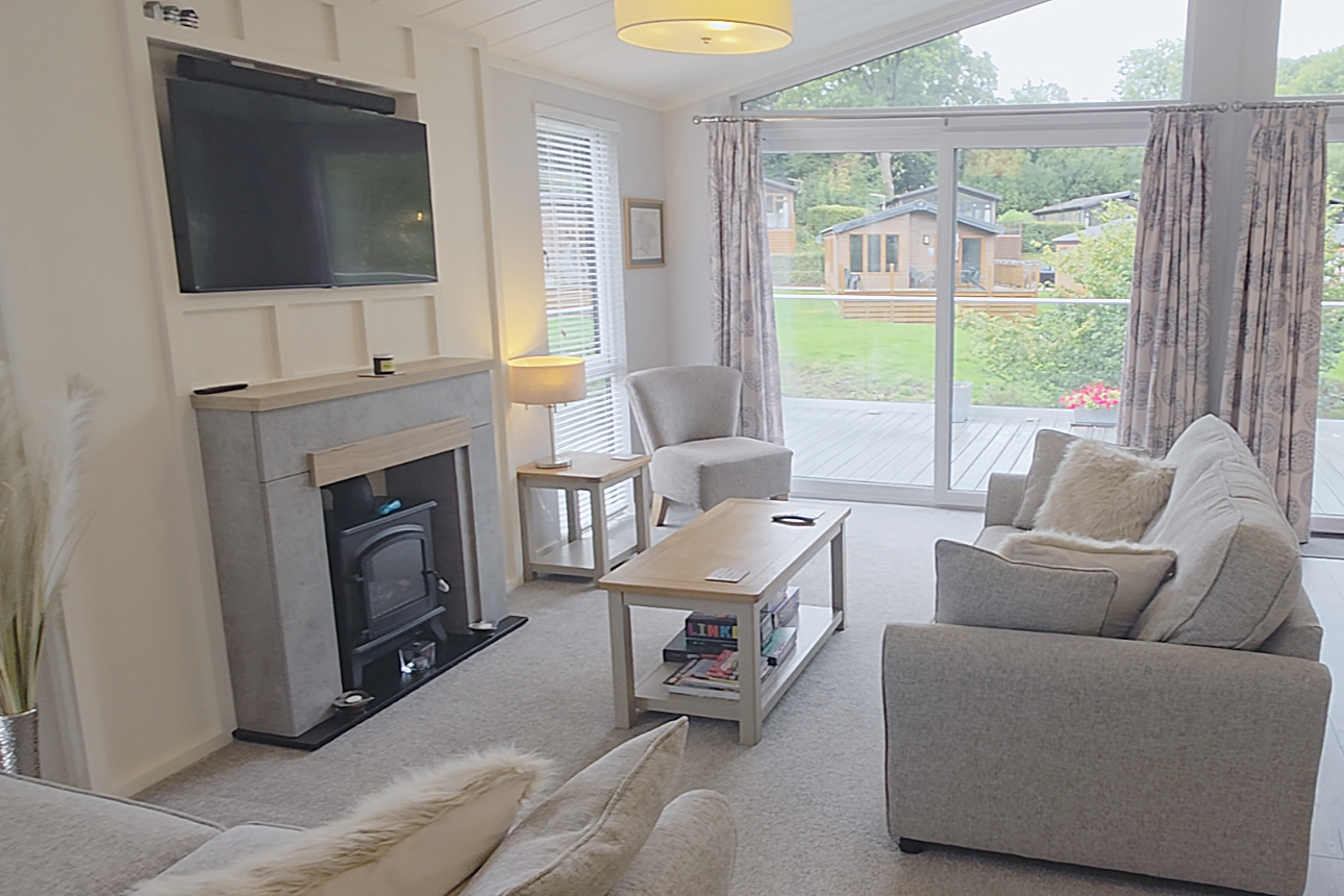 The lodge is perfectly proportioned, with plenty of space throughout creating a warm and inviting atmosphere. It is modern, yet homely with soft grey painted furnishings and real wooden tops in the kitchen. It comes complete with a modern log burner effect fire, and all the modern conveniences including a dishwasher, washing machine, eye level single oven, four burner hob and more.